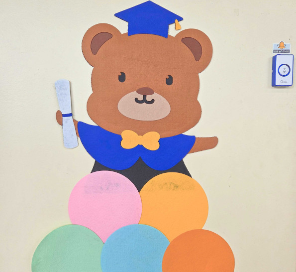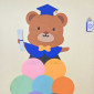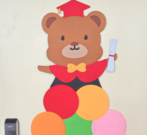 알록달록한 풍선기둥 위에 학사모를 쓴 곰돌이 캐릭터가 올라가 있으니